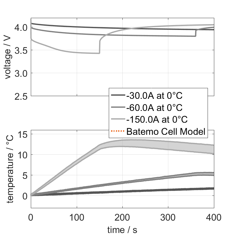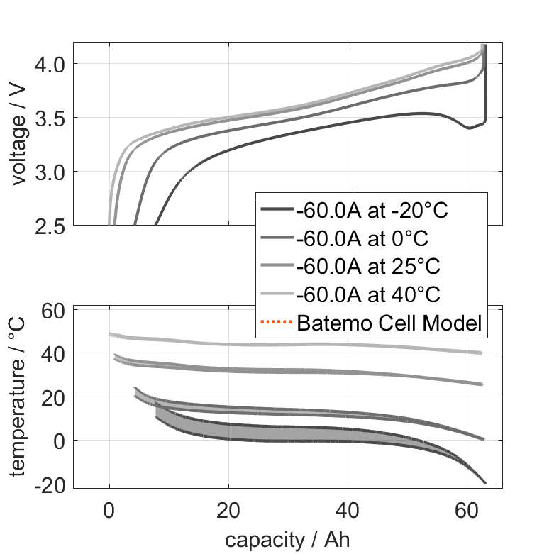 The Batemo Cell Model of the lithium-ion battery cell SKI Kia Niro is a high-precision, physical cell model with global validity. As a digital twin it seamlessly integrates into your research, development and battery analytics by basing your decisions on simulations. See the details to learn more about the features and capabilities of the Batemo Cell Model. Batemo demonstrates the accuracy and validity of the Batemo Cell Model by comparing battery simulation and measurement data in the range given below. Validation is extensive, experimental characterization covers the total operational area of the cell: At low and high temperatures, up to the maximal current and in the whole state of charge range.