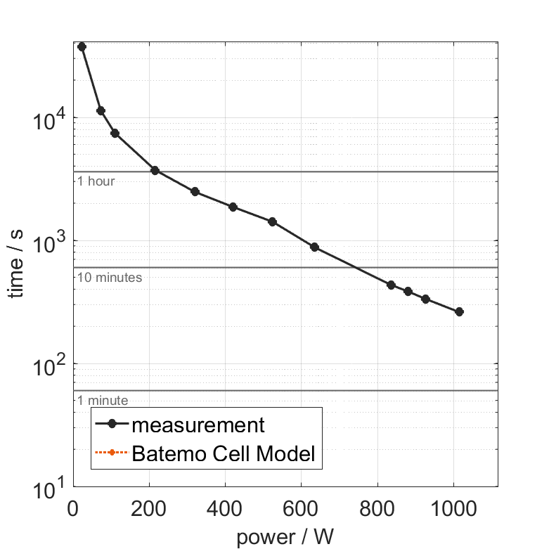 All quantities are measurement results from the Batemo battery laboratory. The continuous power is the highest power that completely discharges the cell without overheating it. Therefore, the cell is discharged from 100% state of charge (SOC) at an ambient temperature of 25°C with a constant current until a residual state of charge of 10% and either the lower voltage limit of 2.5V or 90% of the maximum surface temperature ( 54°C) is reached. The peak power is the power the cell can supply for 5 minutes. The cell is therefore discharged from 100% SOC at an ambient temperature of 25°C with a constant current until it reaches either the lower voltage limit of 2.5V or the maximum surface temperature of 60°C after 5 minutes. For cells that reach the maximum temperature limit, the measured power is directly taken as peak power. For cells that do not reach the maximum surface temperature after 5 minutes because they reach the lower voltage limit first, the measured power is multiplied by a correction factor that estimates the power that would have heated the cell to the maximum surface temperature within 5 minutes. The thermal boundary condition is free convection. These operating conditions may be outside the cell manufacturer’s specification. |