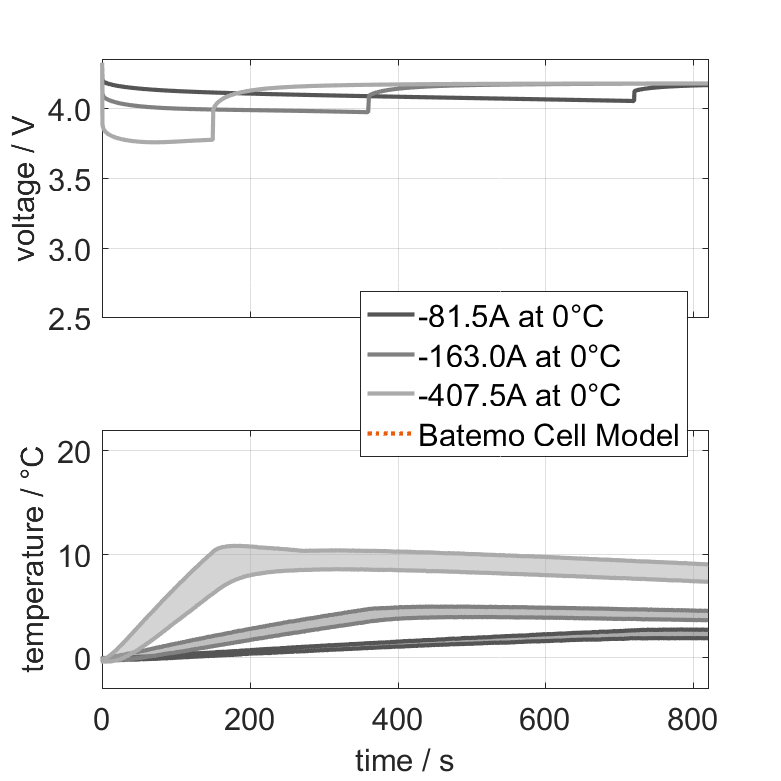 Moreover, the Batemo Cell Model validation will be fully transparent. The Batemo Cell Data contains the raw measurement and simulation data. For all experiments the voltage, temperature, power and energy accuracies are calculated. This allows straight-forward evaluation and analysis of the Batemo Cell Model validity. The graphs show a selection of characteristic data of the cell Sunwoda 163 Ah to evaluate the cell performance. The prediction of the Batemo Cell Model is included as soon as the Batemo Cell Model is finished.