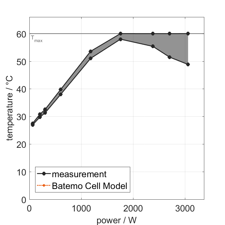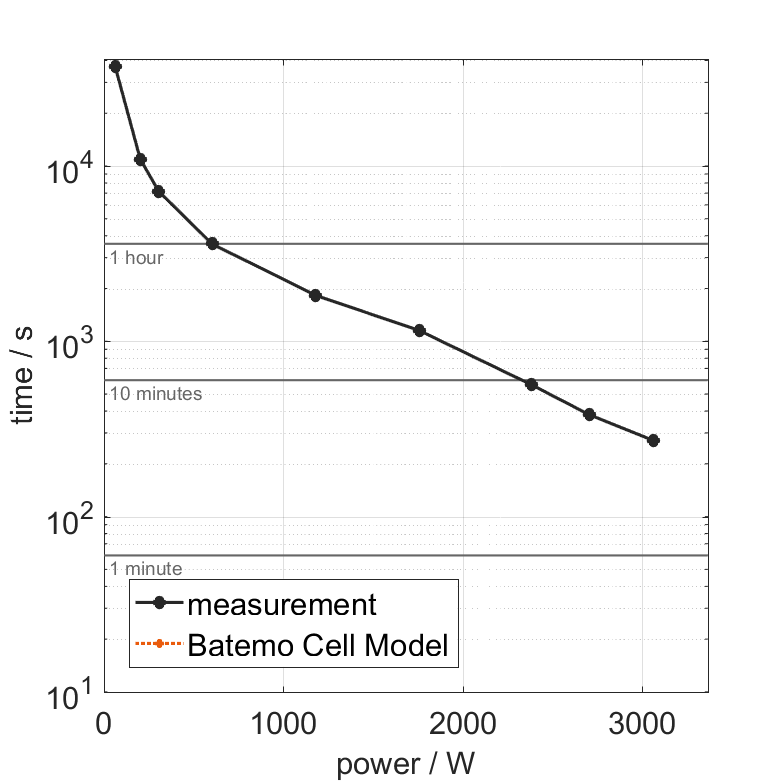All quantities are measurement results from the Batemo battery laboratory. The continuous power is the highest power that completely discharges the cell without overheating it. Therefore, the cell is discharged from 100% state of charge (SOC) at an ambient temperature of 25°C with a constant current until a residual state of charge of 10% and either the lower voltage limit of 2.5V or 90% of the maximum surface temperature ( 54°C) is reached. The peak power is the power the cell can supply for 5 minutes. The cell is therefore discharged from 100% SOC at an ambient temperature of 25°C with a constant current until it reaches either the lower voltage limit of 2.5V or the maximum surface temperature of 60°C after 5 minutes. For cells that reach the maximum temperature limit, the measured power is directly taken as peak power. For cells that do not reach the maximum surface temperature after 5 minutes because they reach the lower voltage limit first, the measured power is multiplied by a correction factor that estimates the power that would have heated the cell to the maximum surface temperature within 5 minutes. The thermal boundary condition is free convection. These operating conditions may be outside the cell manufacturer’s specification. |