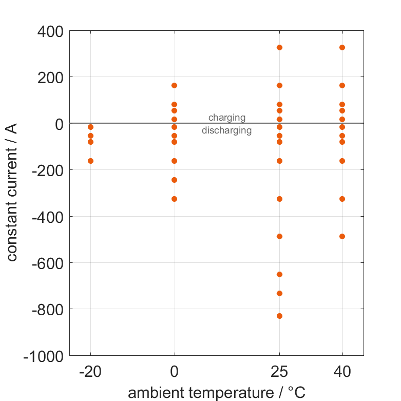 The cell is discharged from 100% SOC or charged from 0% SOC with different constant currents at different ambient temperatures. The thermal boundary condition is free convection. The measurement stops when reaching either the voltage of 2.5V or 4.35V or the surface temperature of 60°C. The graph shows for which ambient temperatures and charging and discharging constant currents measurements are available.