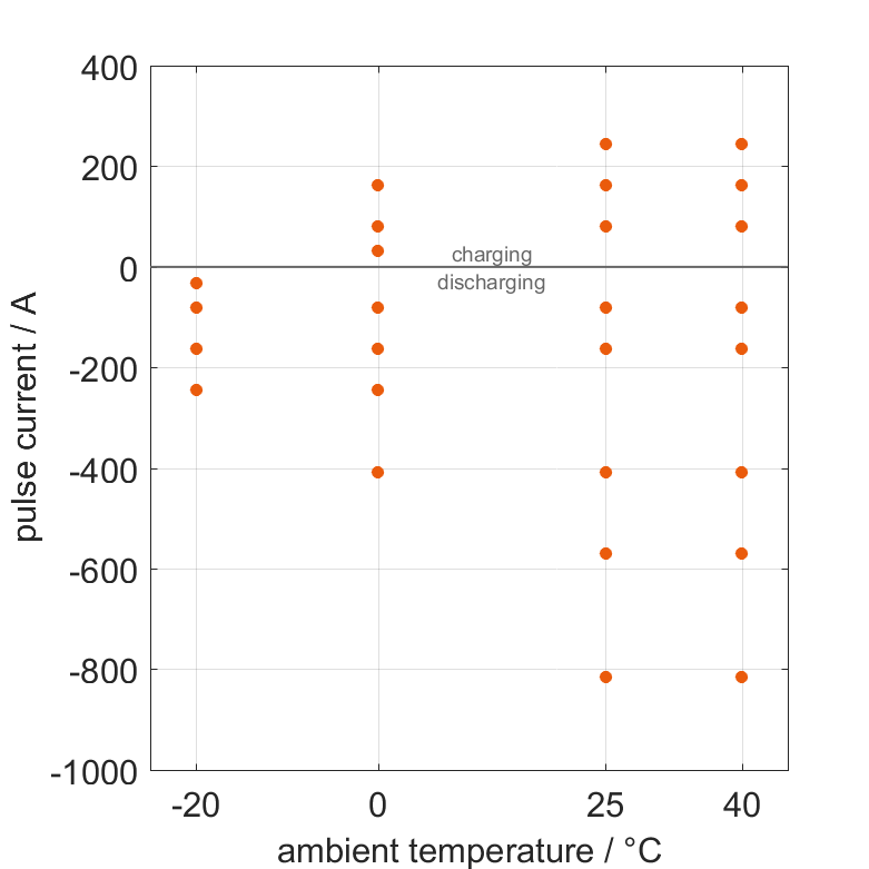 The cell is discharged from 100% SOC or charged from 0% SOC with current pulses followed by no-load phases at different ambient temperatures. The thermal boundary condition is free convection. The measurement stops when reaching either the voltage of 2.5V or 4.35V or the surface temperature of 60°C. The graph shows for which ambient temperatures and pulse currents measurements are available.