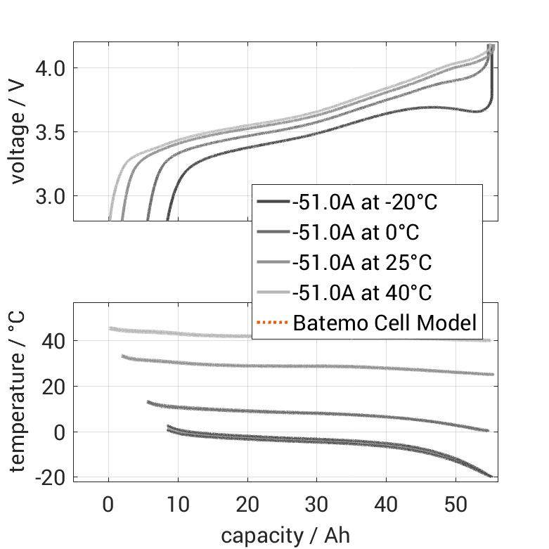The Batemo Cell Model of the lithium-ion battery cell SVOLT PHEV 51Ah is a high-precision, physical cell model with global validity. As a digital twin it seamlessly integrates into your research, development and battery analytics by basing your decisions on simulations. See the details to learn more about the features and capabilities of the Batemo Cell Model. Batemo demonstrates the accuracy and validity of the Batemo Cell Model by comparing battery simulation and measurement data in the range given below. Validation is extensive, experimental characterization covers the total operational area of the cell: At low and high temperatures, up to the maximal current and in the whole state of charge range.
