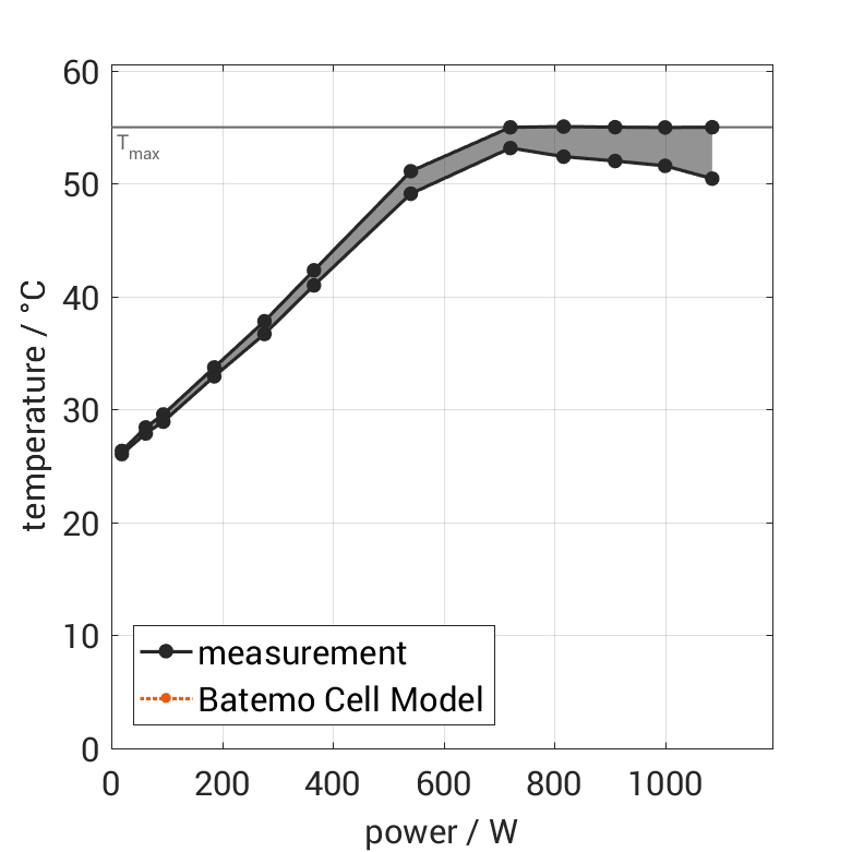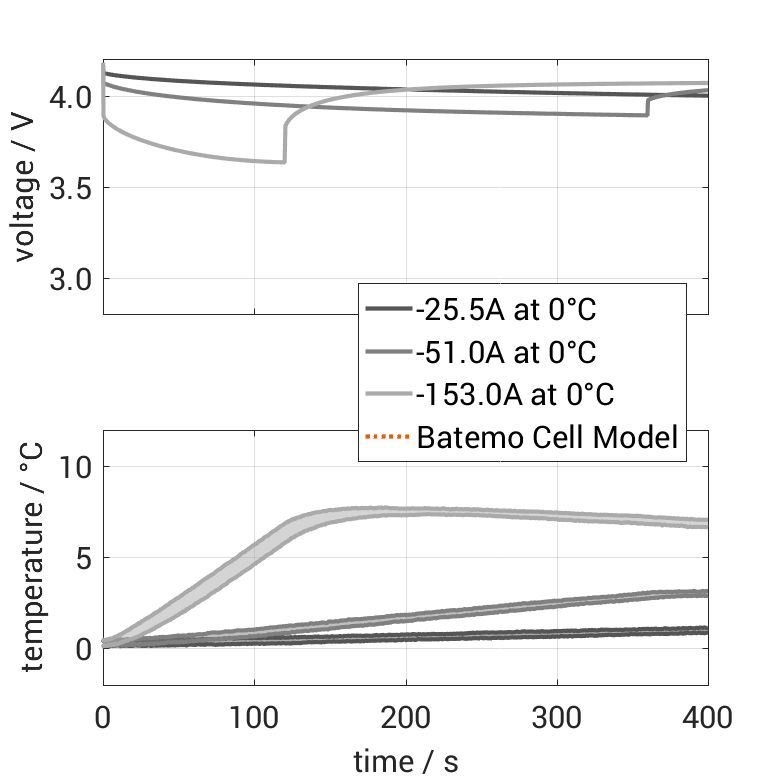 Moreover, the Batemo Cell Model validation will be fully transparent. The Batemo Cell Data contains the raw measurement and simulation data. For all experiments the voltage, temperature, power and energy accuracies are calculated. This allows straight-forward evaluation and analysis of the Batemo Cell Model validity. The graphs show a selection of characteristic data of the cell SVOLT PHEV 51Ah to evaluate the cell performance. The prediction of the Batemo Cell Model is included as soon as the Batemo Cell Model is finished.