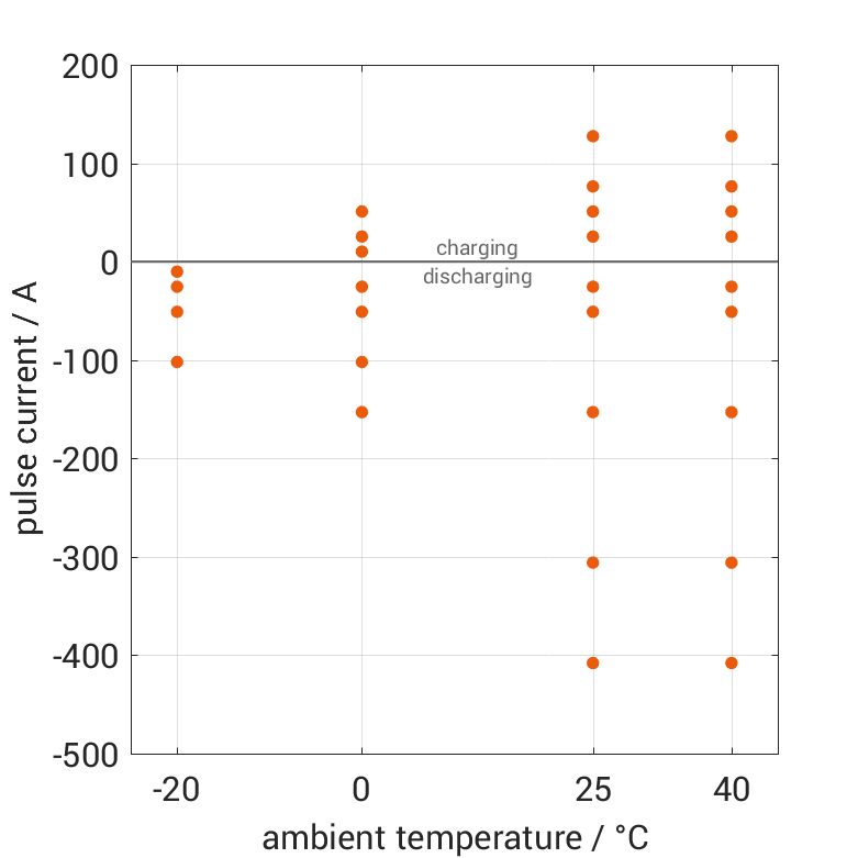 The cell is discharged from 100% SOC or charged from 0% SOC with current pulses followed by no-load phases at different ambient temperatures. The thermal boundary condition is free convection. The measurement stops when reaching either the voltage of 2.8V or 4.2V or the surface temperature of 55°C. The graph shows for which ambient temperatures and pulse currents measurements are available.