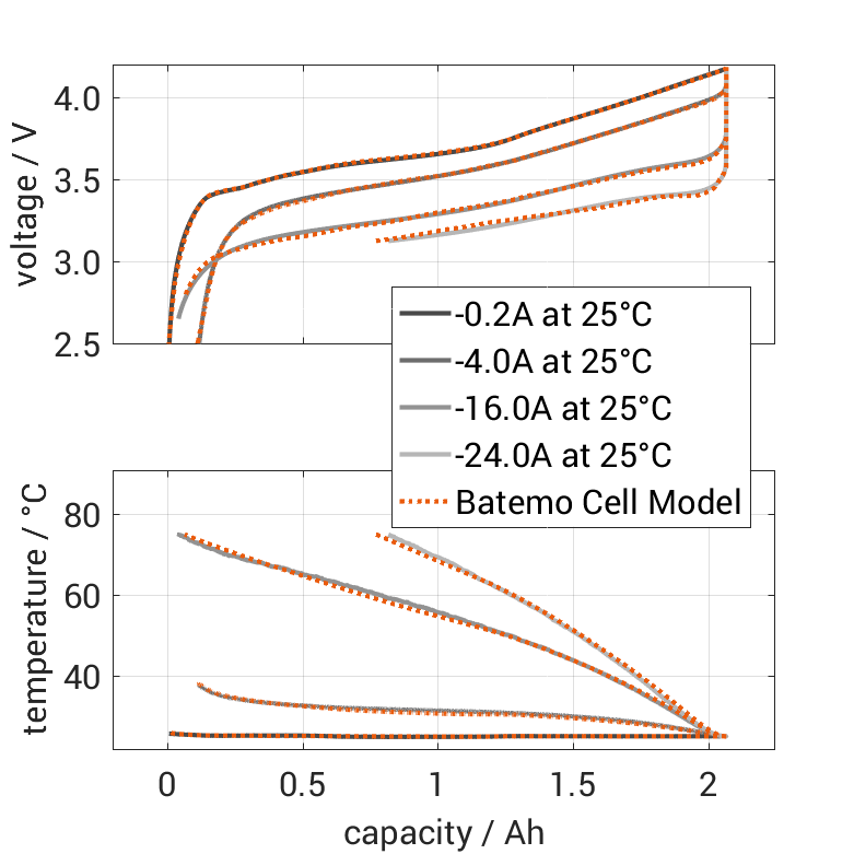 Batemo demonstrates the accuracy and validity of the Batemo Cell Model by comparing battery simulation and measurement data in the range given below. Validation is extensive, experimental characterization covers the total operational area of the cell: At low and high temperatures, up to the maximal current and in the whole state of charge range.