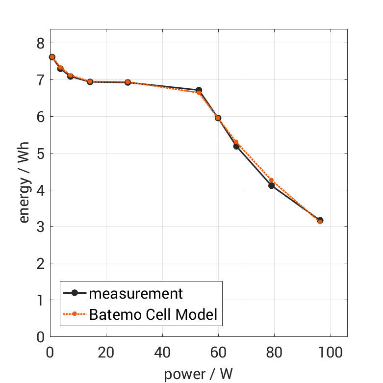 Moreover, the validation of the Batemo Cell Model is fully transparent. The Batemo Cell Data contains the raw measurement and simulation data. For all experiments the voltage, temperature, power and energy accuracies are calculated. This allows straight-forward evaluation and analysis of the Batemo Cell Model validity. The graphs show a selection of characteristic data of the cell Tenpower ICR18650-20SG1 to evaluate the cell performance.