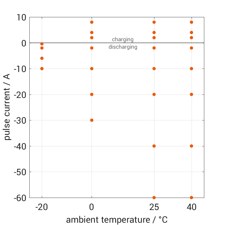 The cell is discharged from 100% SOC or charged from 0% SOC with current pulses followed by no-load phases at different ambient temperatures. The thermal boundary condition is free convection. The measurement stops when reaching either the voltage of 2.5V or 4.2V or the surface temperature of 75°C. The graph shows for which ambient temperatures and pulse currents measurements are available.
