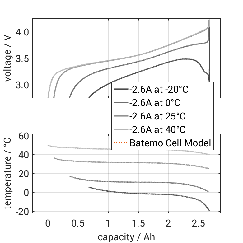 The nominal capacity originates from the manufacturer’s data sheet, if available. When the data sheet is unavailable, the nominal capacity is estimated. Batemo measured the C/10 capacity by discharging the cell at an ambient temperature of 25°C from 100% with a constant current of 0.26A (0.1C) until reaching the voltage of 2.75V. The thermal boundary condition is free convection. |
