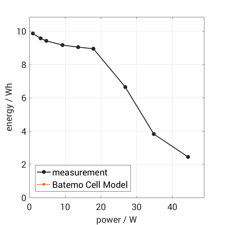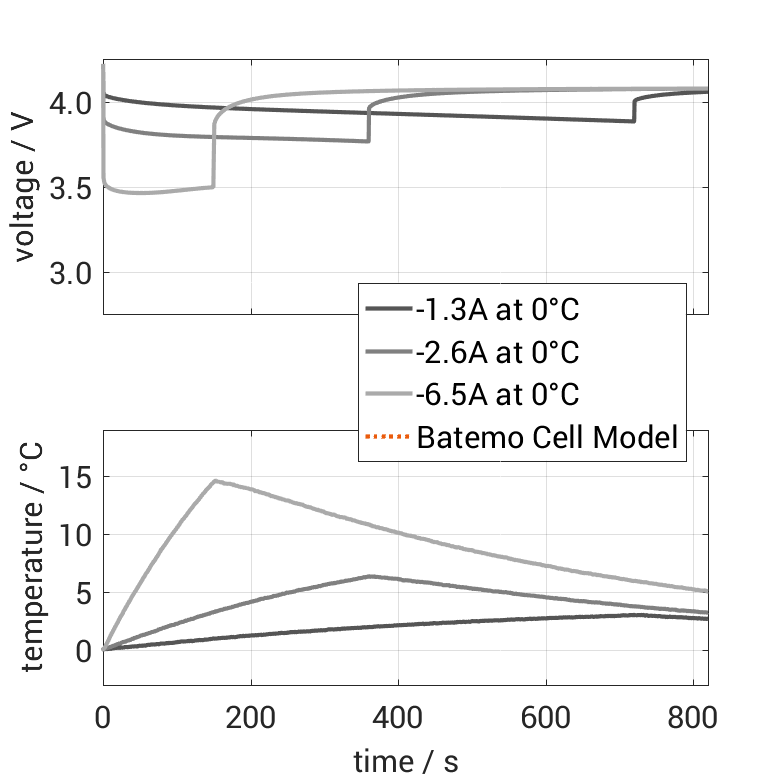 Moreover, the Batemo Cell Model validation will be fully transparent. The Batemo Cell Data contains the raw measurement and simulation data. For all experiments the voltage, temperature, power and energy accuracies are calculated. This allows straight-forward evaluation and analysis of the Batemo Cell Model validity. The graphs show a selection of characteristic data of the cell Tenpower ICR18650-26HE to evaluate the cell performance. The prediction of the Batemo Cell Model is included as soon as the Batemo Cell Model is finished.