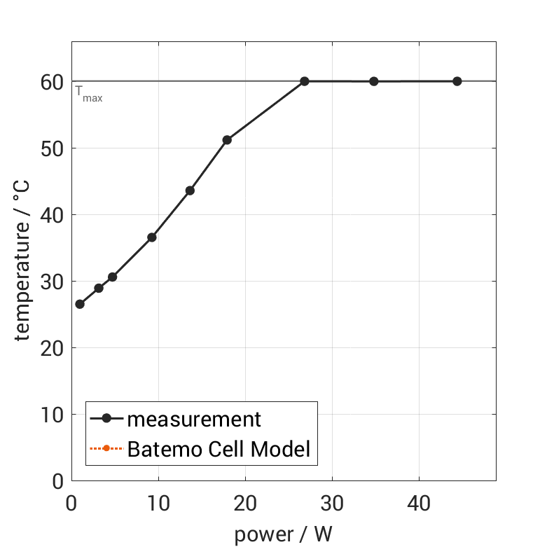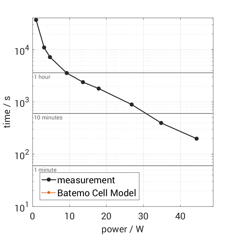 All quantities are measurement results from the Batemo battery laboratory. The continuous power is the highest power that completely discharges the cell without overheating it. Therefore, the cell is discharged from 100% state of charge (SOC) at an ambient temperature of 25°C with a constant current until a residual state of charge of 10% and either the lower voltage limit of 2.75V or 90% of the maximum surface temperature ( 54°C) is reached. The peak power is the power the cell can supply for 5 minutes. The cell is therefore discharged from 100% SOC at an ambient temperature of 25°C with a constant current until it reaches either the lower voltage limit of 2.75V or the maximum surface temperature of 60°C after 5 minutes. For cells that reach the maximum temperature limit, the measured power is directly taken as peak power. For cells that do not reach the maximum surface temperature after 5 minutes because they reach the lower voltage limit first, the measured power is multiplied by a correction factor that estimates the power that would have heated the cell to the maximum surface temperature within 5 minutes. The thermal boundary condition is free convection. These operating conditions may be outside the cell manufacturer’s specification. |