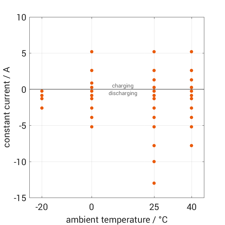 The cell is discharged from 100% SOC or charged from 0% SOC with different constant currents at different ambient temperatures. The thermal boundary condition is free convection. The measurement stops when reaching either the voltage of 2.75V or 4.25V or the surface temperature of 60°C. The graph shows for which ambient temperatures and charging and discharging constant currents measurements are available.