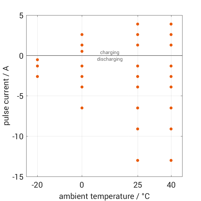 The cell is discharged from 100% SOC or charged from 0% SOC with current pulses followed by no-load phases at different ambient temperatures. The thermal boundary condition is free convection. The measurement stops when reaching either the voltage of 2.75V or 4.25V or the surface temperature of 60°C. The graph shows for which ambient temperatures and pulse currents measurements are available.
