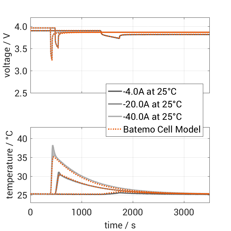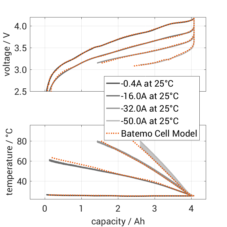 Batemo demon­strates the accuracy and validity of the Batemo Cell Model by comparing battery simula­tion and measure­ment data in the range given below. Valida­tion is exten­sive, exper­i­mental charac­ter­i­za­tion covers the total opera­tional area of the cell: At low and high temper­a­tures, up to the maximal current and in the whole state of charge range.