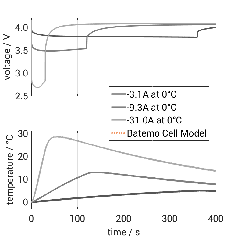 Moreover, the Batemo Cell Model validation will be fully transparent. The Batemo Cell Data contains the raw measurement and simulation data. For all experiments the voltage, temperature, power and energy accuracies are calculated. This allows straight-forward evaluation and analysis of the Batemo Cell Model validity. The graphs show a selection of characteristic data of the cell TerraE INR18650-32P to evaluate the cell performance. The prediction of the Batemo Cell Model is included as soon as the Batemo Cell Model is finished.
