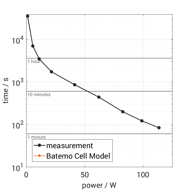 All quantities are measurement results from the Batemo battery laboratory. The continuous power is the highest power that completely discharges the cell without overheating it. Therefore, the cell is discharged from 100% state of charge (SOC) at an ambient temperature of 25°C with a constant current until a residual state of charge of 10% and either the lower voltage limit of 2.5V or 90% of the maximum surface temperature ( 72°C) is reached. The peak power is the power the cell can supply for 5 minutes. The cell is therefore discharged from 100% SOC at an ambient temperature of 25°C with a constant current until it reaches either the lower voltage limit of 2.5V or the maximum surface temperature of 80°C after 5 minutes. For cells that reach the maximum temperature limit, the measured power is directly taken as peak power. For cells that do not reach the maximum surface temperature after 5 minutes because they reach the lower voltage limit first, the measured power is multiplied by a correction factor that estimates the power that would have heated the cell to the maximum surface temperature within 5 minutes. The thermal boundary condition is free convection. These operating conditions may be outside the cell manufacturer’s specification. |