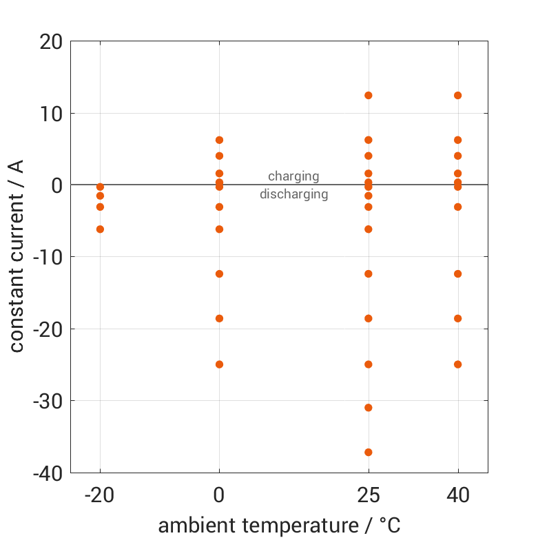 The cell is discharged from 100% SOC or charged from 0% SOC with different constant currents at different ambient temperatures. The thermal boundary condition is free convection. The measurement stops when reaching either the voltage of 2.5V or 4.2V or the surface temperature of 80°C. The graph shows for which ambient temperatures and charging and discharging constant currents measurements are available.