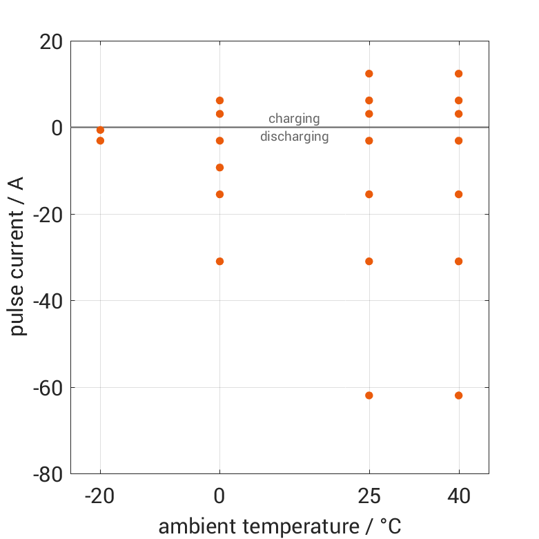 The cell is discharged from 100% SOC or charged from 0% SOC with current pulses followed by no-load phases at different ambient temperatures. The thermal boundary condition is free convection. The measurement stops when reaching either the voltage of 2.5V or 4.2V or the surface temperature of 80°C. The graph shows for which ambient temperatures and pulse currents measurements are available.