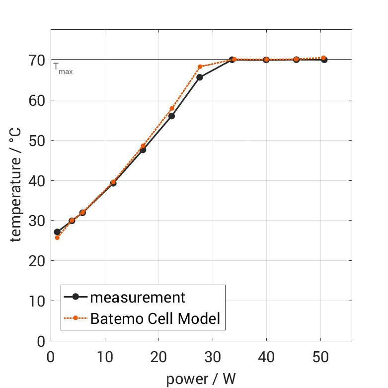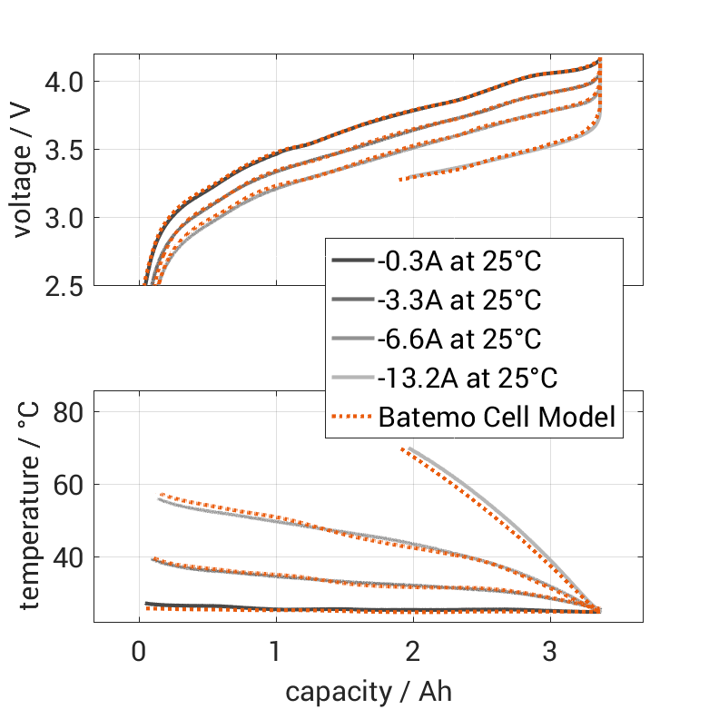Batemo demonstrates the accuracy and validity of the Batemo Cell Model by comparing battery simulation and measurement data in the range given below. Validation is extensive, experimental characterization covers the total operational area of the cell: At low and high temperatures, up to the maximal current and in the whole state of charge range.
