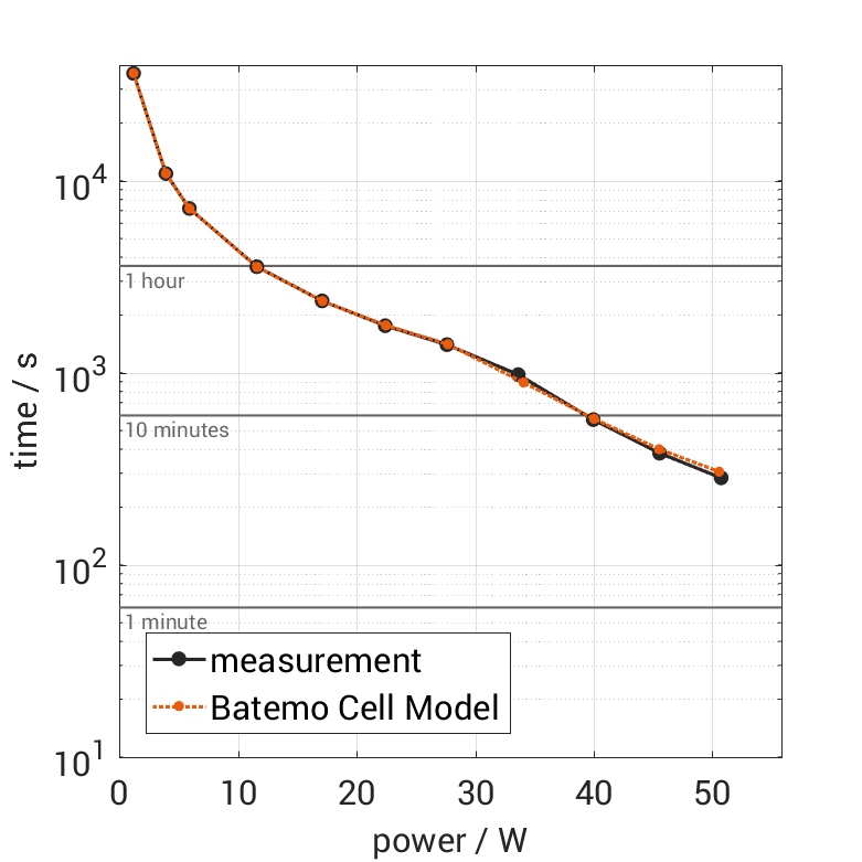 All quantities are measurement results from the Batemo battery laboratory. The continuous power is the highest power that completely discharges the cell without overheating it. Therefore, the cell is discharged from 100% state of charge (SOC) at an ambient temperature of 25°C with a constant current until a residual state of charge of 10% and either the lower voltage limit of 2.5V or 90% of the maximum surface temperature ( 63°C) is reached. The peak power is the power the cell can supply for 5 minutes. The cell is therefore discharged from 100% SOC at an ambient temperature of 25°C with a constant current until it reaches either the lower voltage limit of 2.5V or the maximum surface temperature of 70°C after 5 minutes. For cells that reach the maximum temperature limit, the measured power is directly taken as peak power. For cells that do not reach the maximum surface temperature after 5 minutes because they reach the lower voltage limit first, the measured power is multiplied by a correction factor that estimates the power that would have heated the cell to the maximum surface temperature within 5 minutes. The thermal boundary condition is free convection. These operating conditions may be outside the cell manufacturer’s specification. |