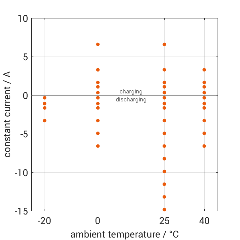 The cell is discharged from 100% SOC or charged from 0% SOC with different constant currents at different ambient temperatures. The thermal boundary condition is free convection. The measurement stops when reaching either the voltage of 2.5V or 4.2V or the surface temperature of 70°C. The graph shows for which ambient temperatures and charging and discharging constant currents measurements are available.