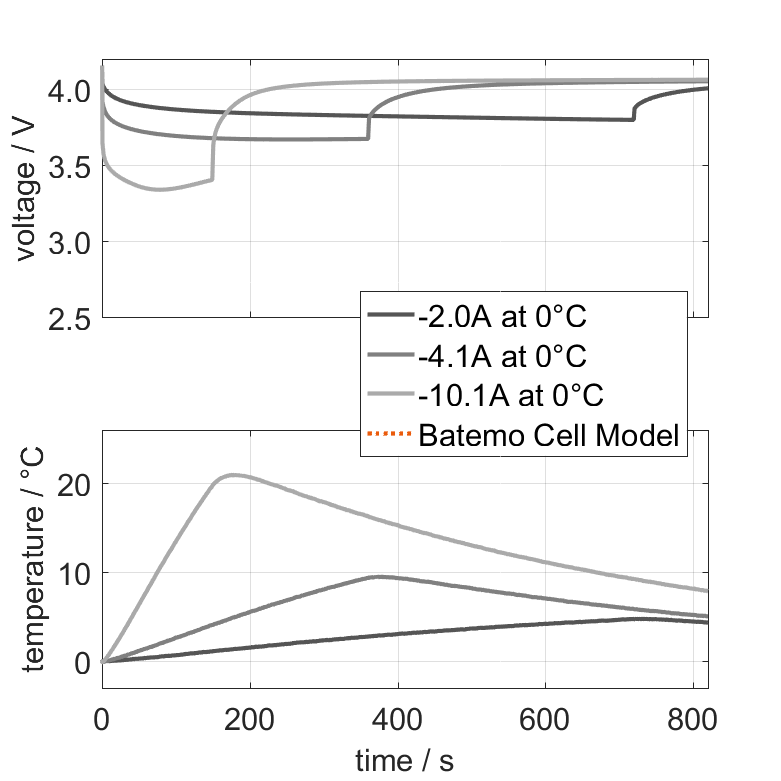 The nominal capacity originates from the manufacturer’s data sheet, if available. When the data sheet is unavailable, the nominal capacity is estimated. Batemo measured the C/10 capacity by discharging the cell at an ambient temperature of 25°C from 100% with a constant current of 0.41A (0.1C) until reaching the voltage of 2.5V. The thermal boundary condition is free convection. |
