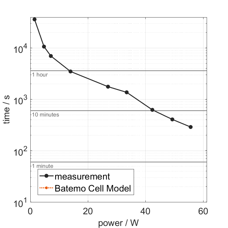 All quantities are measurement results from the Batemo battery laboratory. The continuous power is the highest power that completely discharges the cell without overheating it. Therefore, the cell is discharged from 100% state of charge (SOC) at an ambient temperature of 25°C with a constant current until a residual state of charge of 10% and either the lower voltage limit of 2.5V or 90% of the maximum surface temperature ( 63°C) is reached. The peak power is the power the cell can supply for 5 minutes. The cell is therefore discharged from 100% SOC at an ambient temperature of 25°C with a constant current until it reaches either the lower voltage limit of 2.5V or the maximum surface temperature of 70°C after 5 minutes. For cells that reach the maximum temperature limit, the measured power is directly taken as peak power. For cells that do not reach the maximum surface temperature after 5 minutes because they reach the lower voltage limit first, the measured power is multiplied by a correction factor that estimates the power that would have heated the cell to the maximum surface temperature within 5 minutes. The thermal boundary condition is free convection. These operating conditions may be outside the cell manufacturer’s specification. |