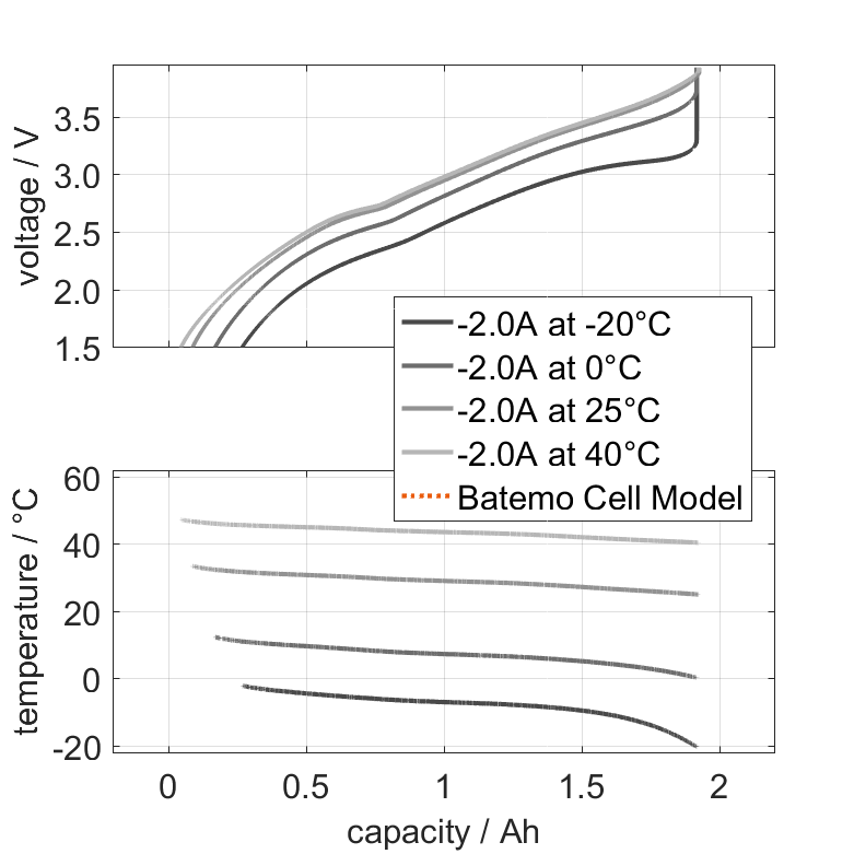 The cell is discharged from 100% SOC with different constant currents at different ambient temper­a­tures. The thermal boundary condi­tion is free convec­tion. The measure­ment stops when reaching either the voltage of 1.5V or the surface temper­a­ture of 60°C.