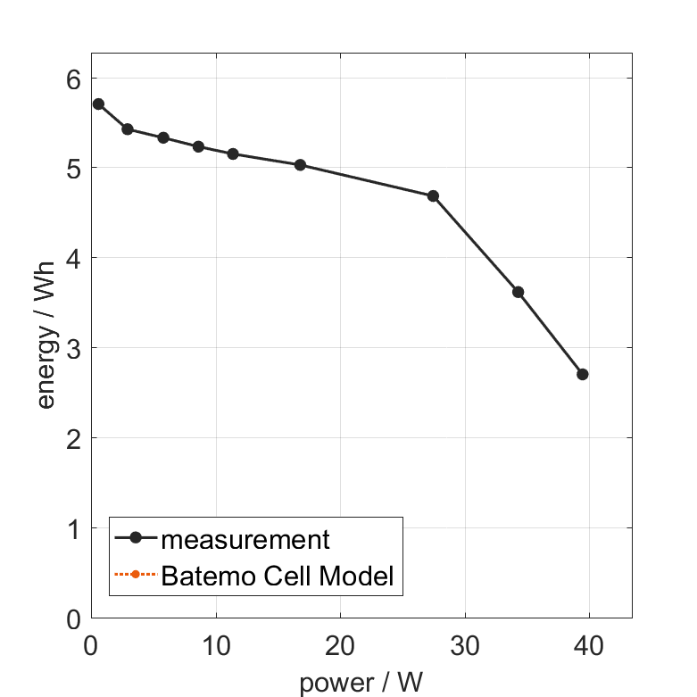 The cell is discharged from 100% SOC with different constant currents at 25°C. The thermal boundary condi­tion is free convec­tion. The measure­ment stops when reaching either the voltage of 1.5V or the surface temper­a­ture of 60°C. The graph shows the derived exchanged energy and average power of the experiment.