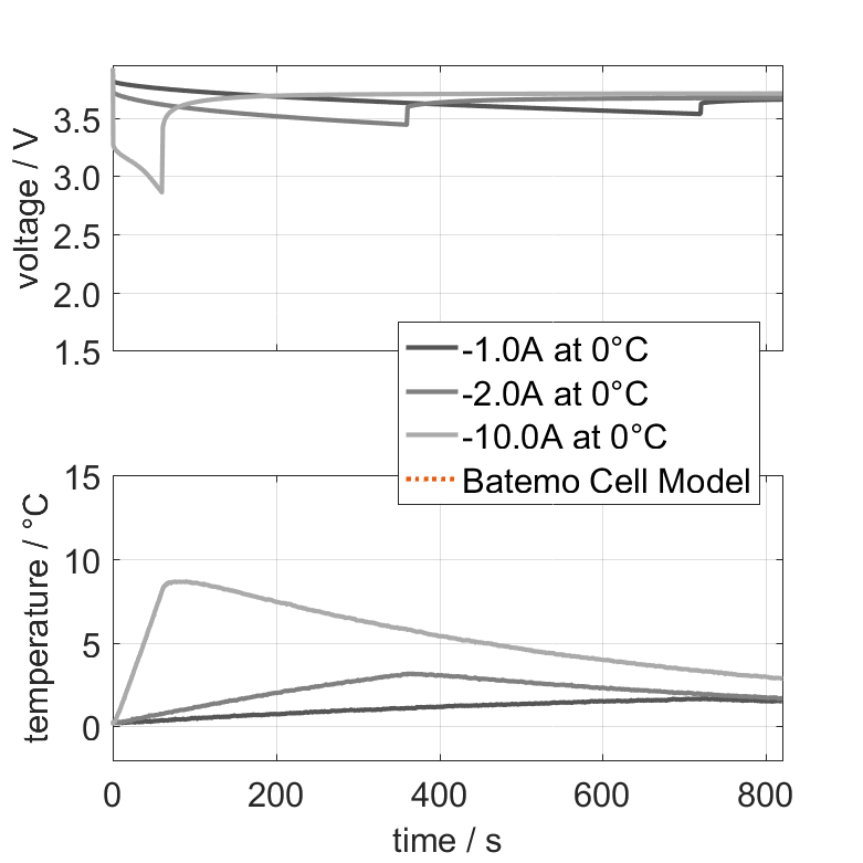 The cell is discharged from 100% SOC with current pulses followed by no-load phases at different ambient temper­a­tures. The thermal boundary condi­tion is free convec­tion. The measure­ment stops when reaching either the voltage of 1.5V or the surface temper­a­ture of 60°C. The graph shows a zoomed view of the measure­ment to visualize one of the pulses.