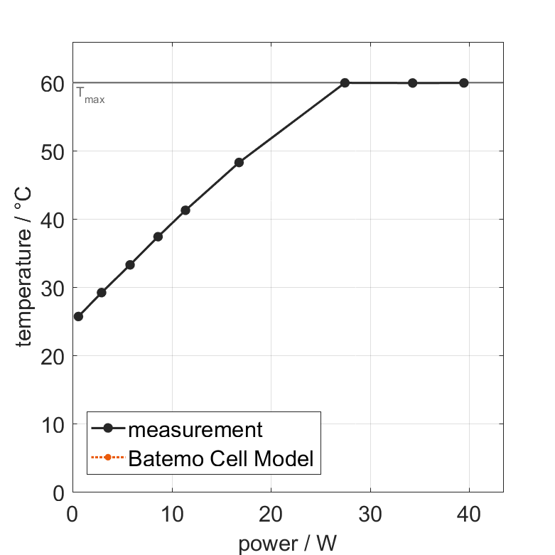 The cell is discharged from 100% SOC with different constant currents at 25°C. The thermal boundary condi­tion is free convec­tion. The measure­ment stops when reaching either the voltage of 1.5V or the surface temper­a­ture of 60°C. The graph shows the cell surface temper­a­ture at the end and the derived average power of the experiment.
