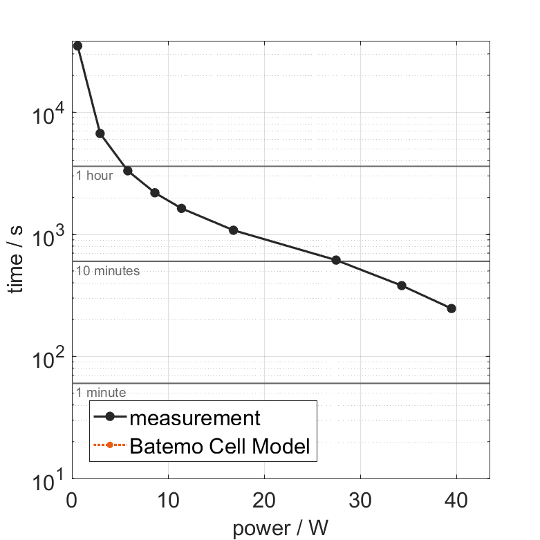 The cell is discharged from 100% SOC with different constant currents at 25°C. The thermal boundary condi­tion is free convec­tion. The measure­ment stops when reaching either the voltage of 1.5V or the surface temper­a­ture of 60°C. The graph shows the derived exper­i­ment duration and average power of the experiment.