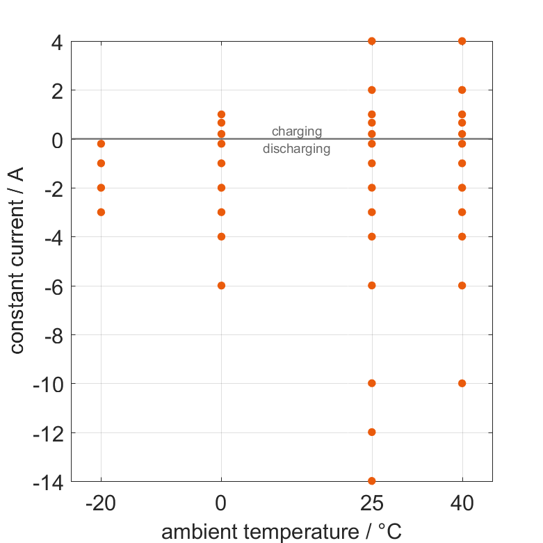 The cell is discharged from 100% SOC or charged from 0% SOC with different constant currents at different ambient temper­a­tures. The thermal boundary condi­tion is free convec­tion. The measure­ment stops when reaching either the voltage of 1.5V or 3.95V or the surface temper­a­ture of 60°C. The graph shows for which ambient temper­a­tures and charging and discharging constant currents measure­ments are available.