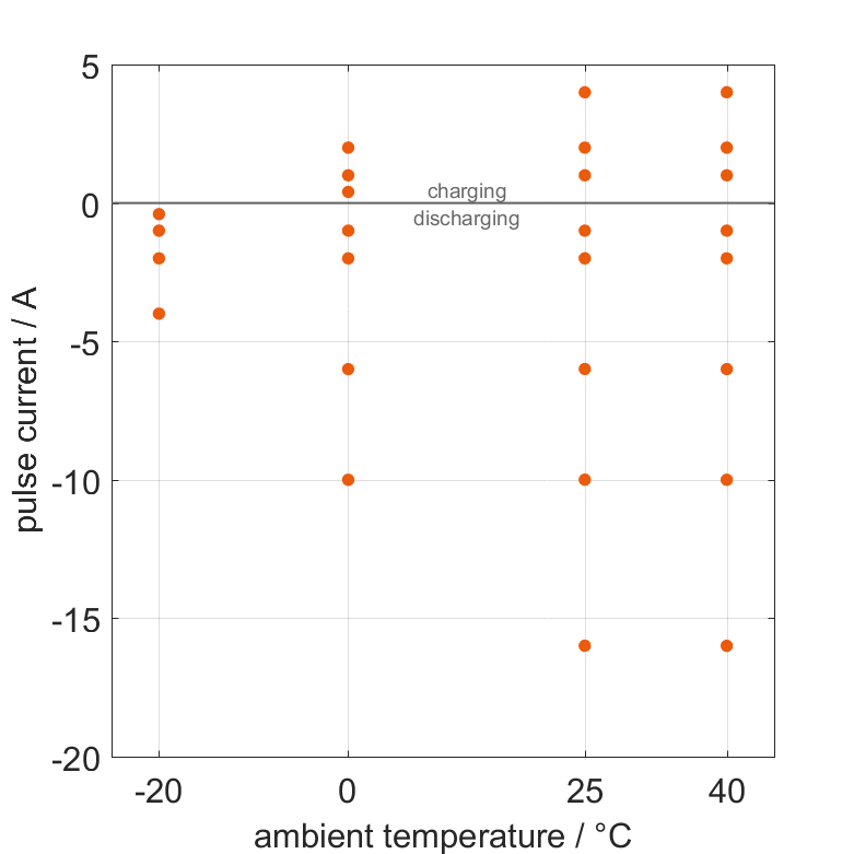 The cell is discharged from 100% SOC or charged from 0% SOC with current pulses followed by no-load phases at different ambient temper­a­tures. The thermal boundary condi­tion is free convec­tion. The measure­ment stops when reaching either the voltage of 1.5V or 3.95V or the surface temper­a­ture of 60°C. The graph shows for which ambient temper­a­tures and pulse currents measure­ments are available.