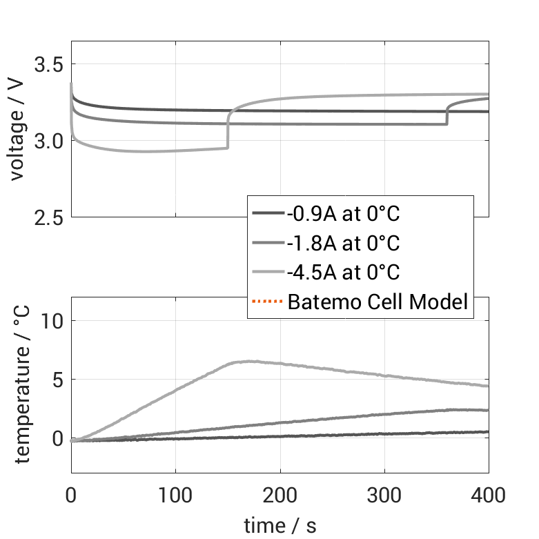 The Batemo Cell Model of the lithium-ion battery cell THLB IFR18650-1800mAh is a high-preci­sion, physical cell model with global validity. As a digital twin it seamlessly integrates into your research, development and battery analytics by basing your decisions on simula­tions. See the details to learn more about the features and capabil­i­ties of the Batemo Cell Model. Batemo demon­strates the accuracy and validity of the Batemo Cell Model by comparing battery simula­tion and measure­ment data in the range given below. Valida­tion is exten­sive, exper­i­mental charac­ter­i­za­tion covers the total opera­tional area of the cell: At low and high temper­a­tures, up to the maximal current and in the whole state of charge range.