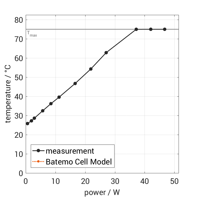 The cell is discharged from 100% SOC with different constant currents at 25°C. The thermal boundary condi­tion is free convec­tion. The measure­ment stops when reaching either the voltage of 2.5V or the surface temper­a­ture of 75°C. The graph shows the cell surface temper­a­ture at the end and the derived average power of the experiment.