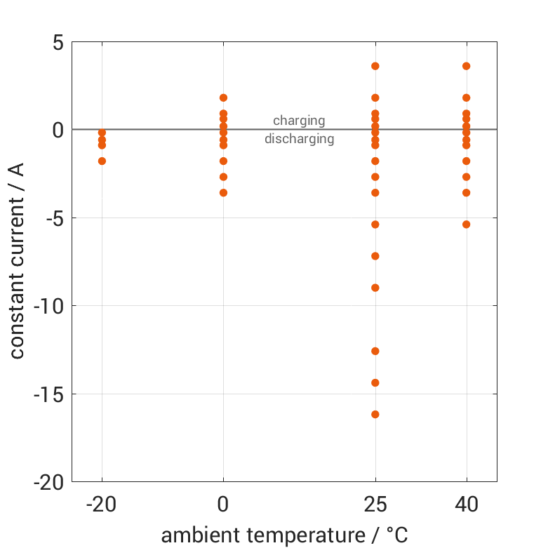 The cell is discharged from 100% SOC or charged from 0% SOC with different constant currents at different ambient temper­a­tures. The thermal boundary condi­tion is free convec­tion. The measure­ment stops when reaching either the voltage of 2.5V or 3.6V or the surface temper­a­ture of 75°C. The graph shows for which ambient temper­a­tures and charging and discharging constant currents measure­ments are available.