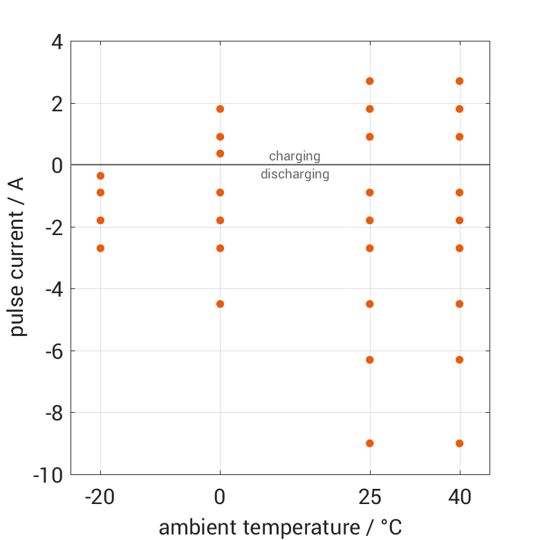 The cell is discharged from 100% SOC or charged from 0% SOC with current pulses followed by no-load phases at different ambient temper­a­tures. The thermal boundary condi­tion is free convec­tion. The measure­ment stops when reaching either the voltage of 2.5V or 3.6V or the surface temper­a­ture of 75°C. The graph shows for which ambient temper­a­tures and pulse currents measure­ments are available.