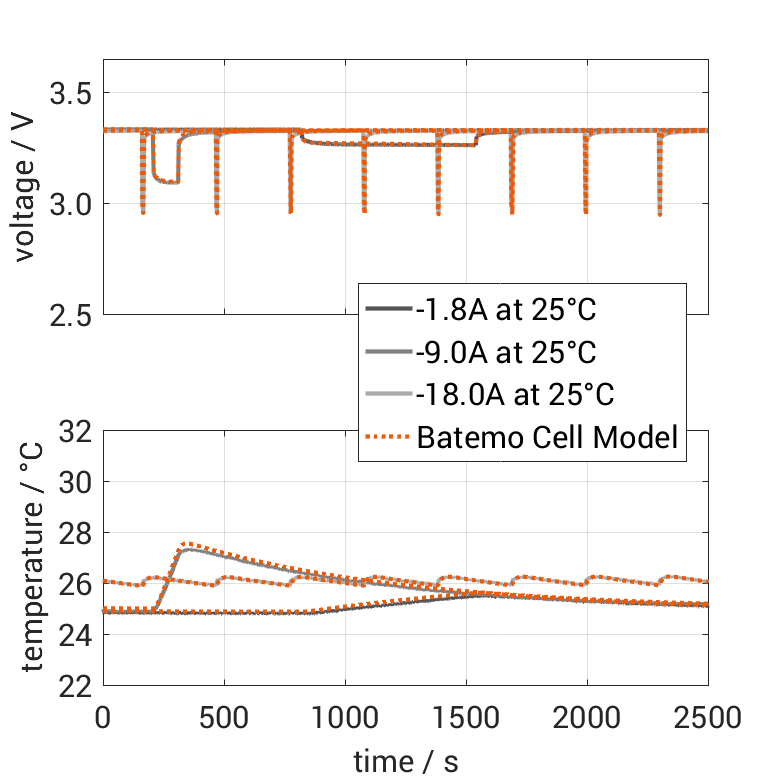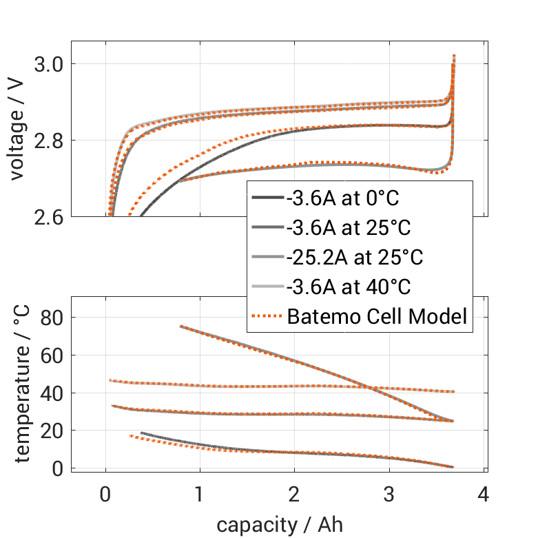 Batemo demon­strates the accuracy and validity of the Batemo Cell Model by comparing battery simula­tion and measure­ment data in the range given below. Valida­tion is exten­sive, exper­i­mental charac­ter­i­za­tion covers the total opera­tional area of the cell: At low and high temper­a­tures, up to the maximal current and in the whole state of charge range.
