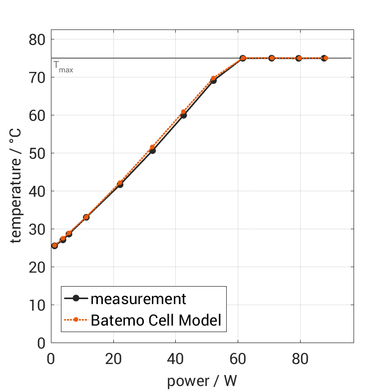 The cell is discharged from 100% SOC with different constant currents at 25°C. The thermal boundary condi­tion is free convec­tion. The measure­ment stops when reaching either the voltage of 2.5V or the surface temper­a­ture of 75°C. The graph shows the cell surface temper­a­ture at the end and the derived average power of the experiment.