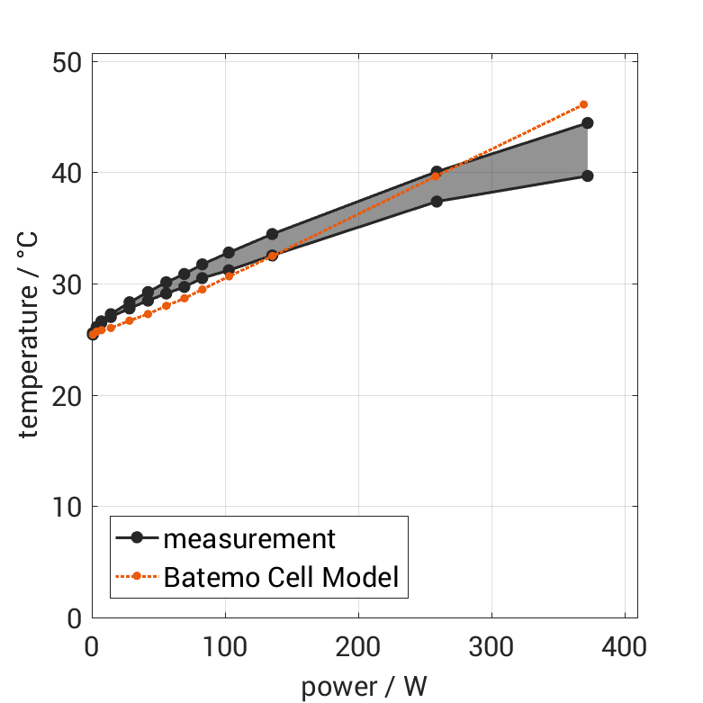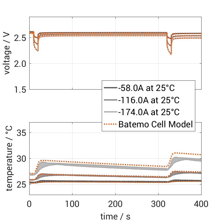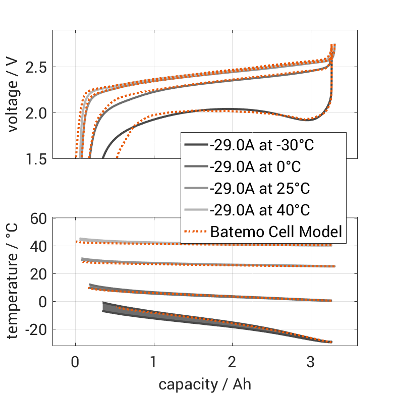 Batemo demon­strates the accuracy and validity of the Batemo Cell Model by comparing battery simula­tion and measure­ment data in the range given below. Valida­tion is exten­sive, exper­i­mental charac­ter­i­za­tion covers the total opera­tional area of the cell: At low and high temper­a­tures, up to the maximal current and in the whole state of charge range.