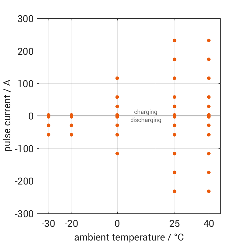 The cell is discharged from 100% SOC or charged from 0% SOC with current pulses followed by no-load phases at different ambient temper­a­tures. The thermal boundary condi­tion is free convec­tion. The measure­ment stops when reaching either the voltage of 1.5V or 2.9V or the surface temper­a­ture of 60°C. The graph shows for which ambient temper­a­tures and pulse currents measure­ments are available.