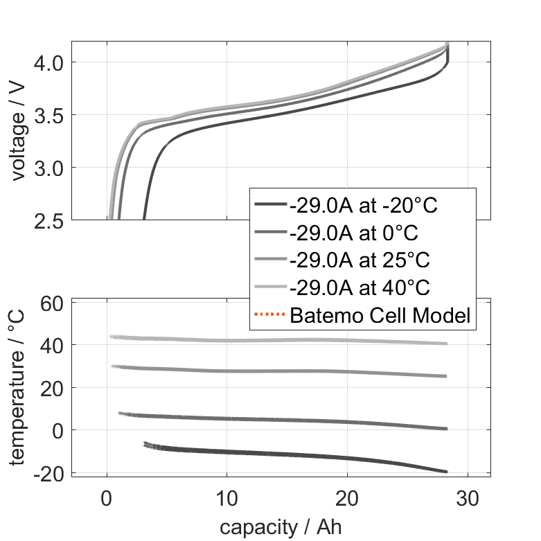 The nominal capacity originates from the manufacturer’s data sheet, if available. When the data sheet is unavailable, the nominal capacity is estimated. Batemo measured the C/10 capacity by discharging the cell at an ambient temperature of 25°C from 100% with a constant current of 2.90A (0.1C) until reaching the voltage of 2.5V. The thermal boundary condition is free convection. |