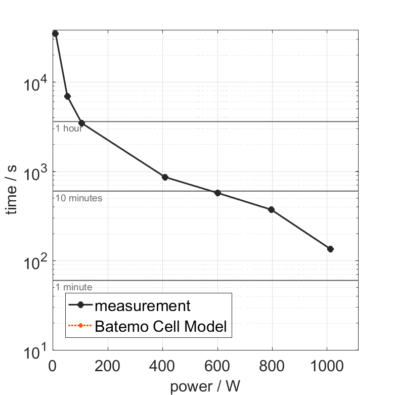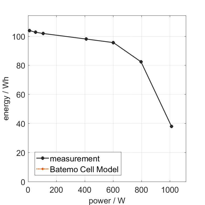 All quantities are measurement results from the Batemo battery laboratory. The continuous power is the highest power that completely discharges the cell without overheating it. Therefore, the cell is discharged from 100% state of charge (SOC) at an ambient temperature of 25°C with a constant current until a residual state of charge of 10% and either the lower voltage limit of 2.5V or 90% of the maximum surface temperature ( 54°C) is reached. The peak power is the power the cell can supply for 5 minutes. The cell is therefore discharged from 100% SOC at an ambient temperature of 25°C with a constant current until it reaches either the lower voltage limit of 2.5V or the maximum surface temperature of 60°C after 5 minutes. For cells that reach the maximum temperature limit, the measured power is directly taken as peak power. For cells that do not reach the maximum surface temperature after 5 minutes because they reach the lower voltage limit first, the measured power is multiplied by a correction factor that estimates the power that would have heated the cell to the maximum surface temperature within 5 minutes. The thermal boundary condition is free convection. These operating conditions may be outside the cell manufacturer’s specification. |