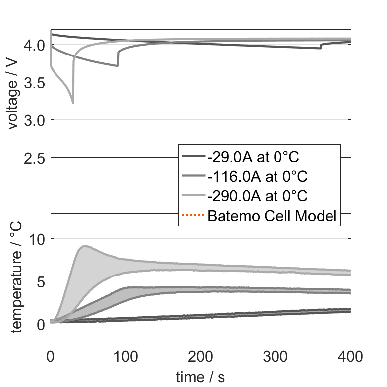 The Batemo Cell Model of the lithium-ion battery cell Honda Clarity is a high-precision, physical cell model with global validity. As a digital twin it seamlessly integrates into your research, development and battery analytics by basing your decisions on simulations. See the details to learn more about the features and capabilities of the Batemo Cell Model. Batemo demonstrates the accuracy and validity of the Batemo Cell Model by comparing battery simulation and measurement data in the range given below. Validation is extensive, experimental characterization covers the total operational area of the cell: At low and high temperatures, up to the maximal current and in the whole state of charge range.