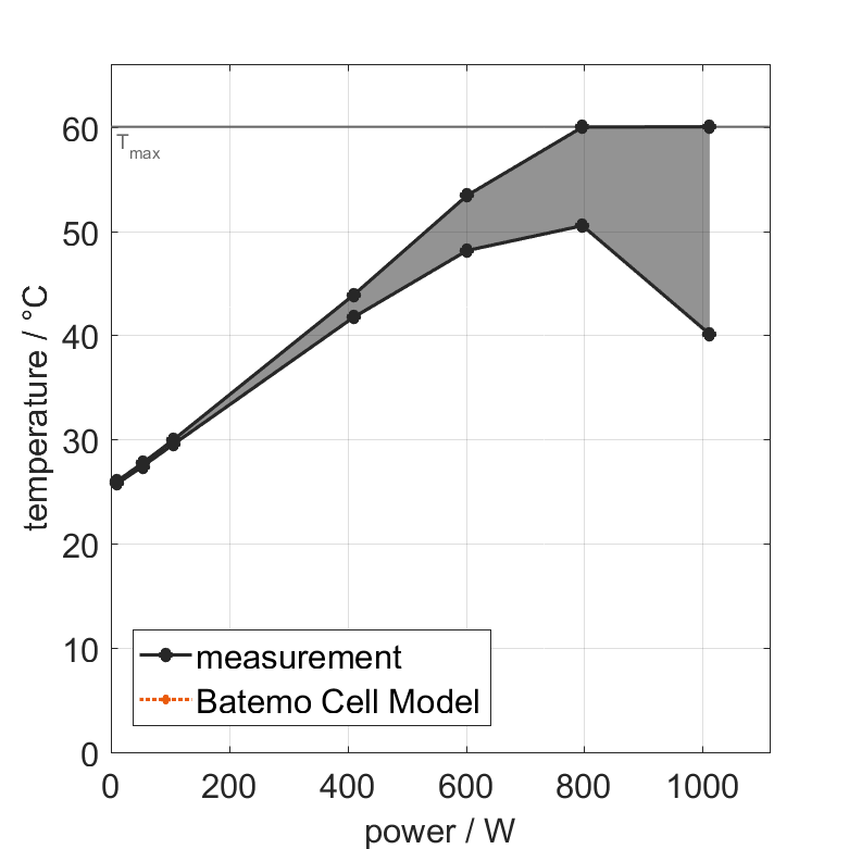 Moreover, the Batemo Cell Model validation will be fully transparent. The Batemo Cell Data contains the raw measurement and simulation data. For all experiments the voltage, temperature, power and energy accuracies are calculated. This allows straight-forward evaluation and analysis of the Batemo Cell Model validity. The graphs show a selection of characteristic data of the cell Honda Clarity to evaluate the cell performance. The prediction of the Batemo Cell Model is included as soon as the Batemo Cell Model is finished.