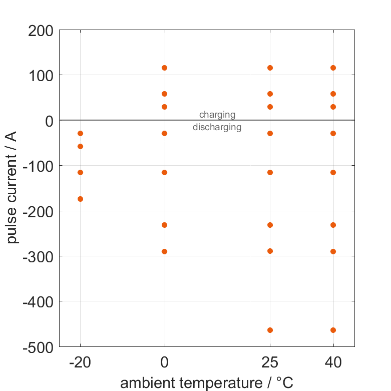The cell is discharged from 100% SOC or charged from 0% SOC with current pulses followed by no-load phases at different ambient temperatures. The thermal boundary condition is free convection. The measurement stops when reaching either the voltage of 2.5V or 4.2V or the surface temperature of 60°C. The graph shows for which ambient temperatures and pulse currents measurements are available.