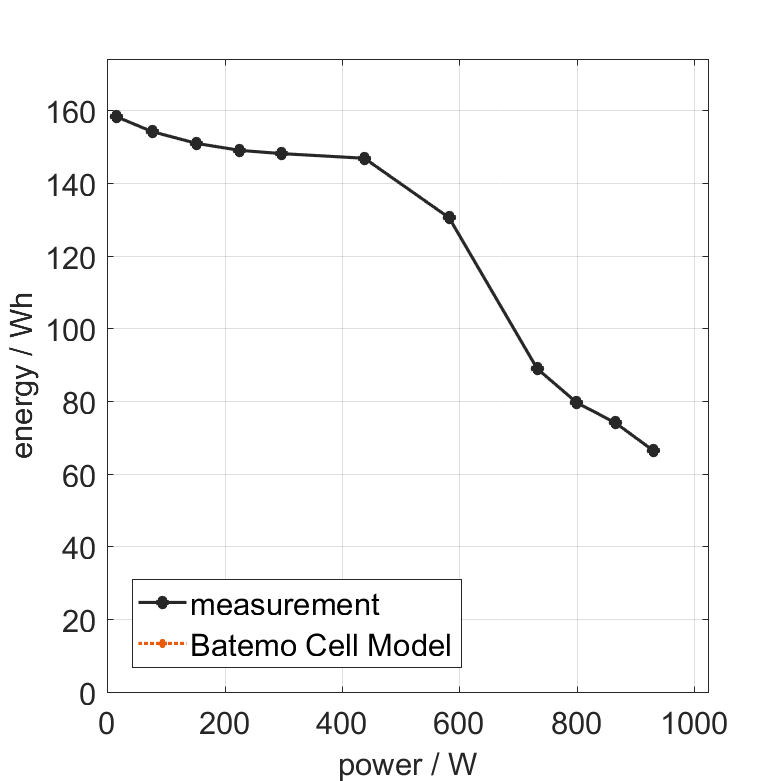 The cell is discharged from 100% SOC with different constant currents at 25°C. The thermal boundary condi­tion is free convec­tion. The measure­ment stops when reaching either the voltage of 2.5V or the surface temper­a­ture of 60°C. The graph shows the derived exchanged energy and average power of the experiment.