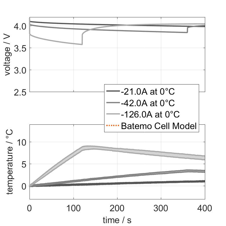 Moreover, the Batemo Cell Model valida­tion will be fully trans­parent. The Batemo Cell Data contains the raw measure­ment and simula­tion data. For all exper­i­ments the voltage, temper­a­ture, power and energy accura­cies are calcu­lated. This allows straight-forward evalu­a­tion and analysis of the Batemo Cell Model validity. The graphs show a selec­tion of charac­ter­istic data of the cell Lincoln Aviator to evaluate the cell perfor­mance. The predic­tion of the Batemo Cell Model is included as soon as the Batemo Cell Model is finished.