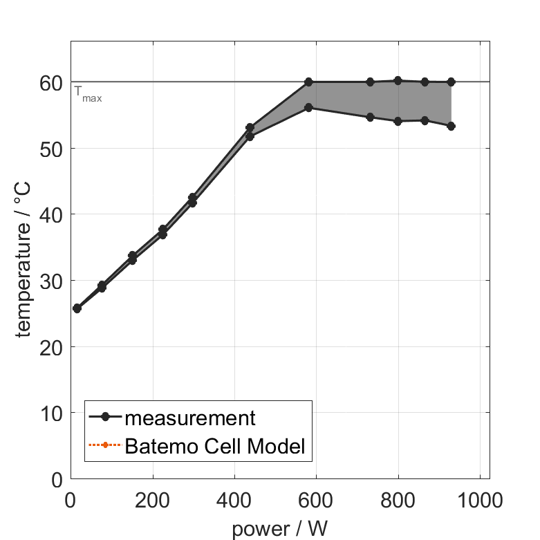 The cell is discharged from 100% SOC with different constant currents at 25°C. The thermal boundary condi­tion is free convec­tion. The measure­ment stops when reaching either the voltage of 2.5V or the surface temper­a­ture of 60°C. The graph shows the cell surface temper­a­ture at the end and the derived average power of the experiment.